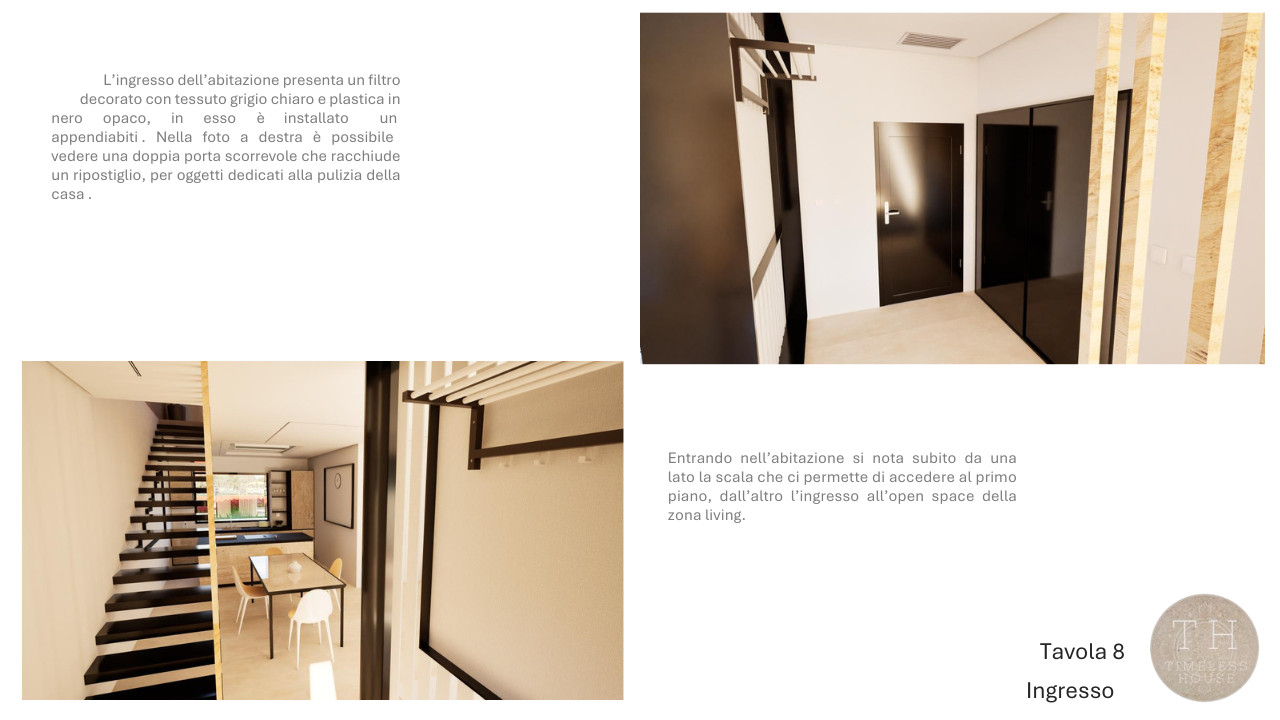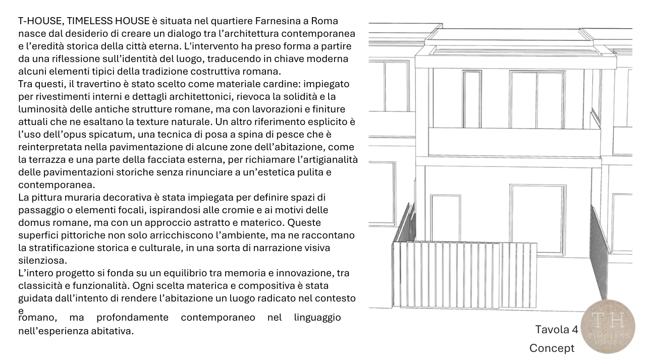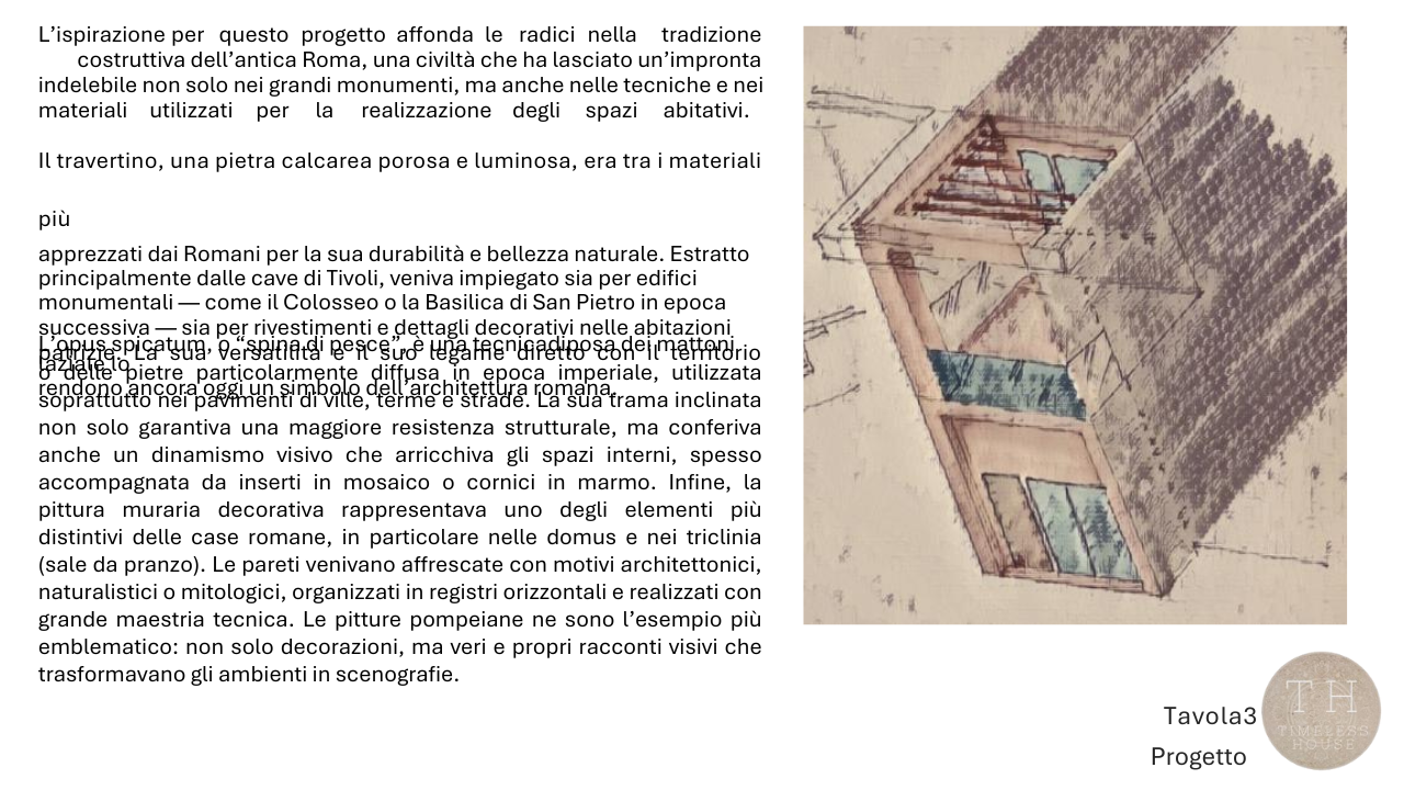 Il project work “Timeless House” di Andrea Pistilli propone lo sviluppo di un progetto di interior design che dialoga con l’eredità architettonica di Roma antica, presentato come un equilibrio tra memoria storica, materiali naturali e linguaggio contemporaneo.